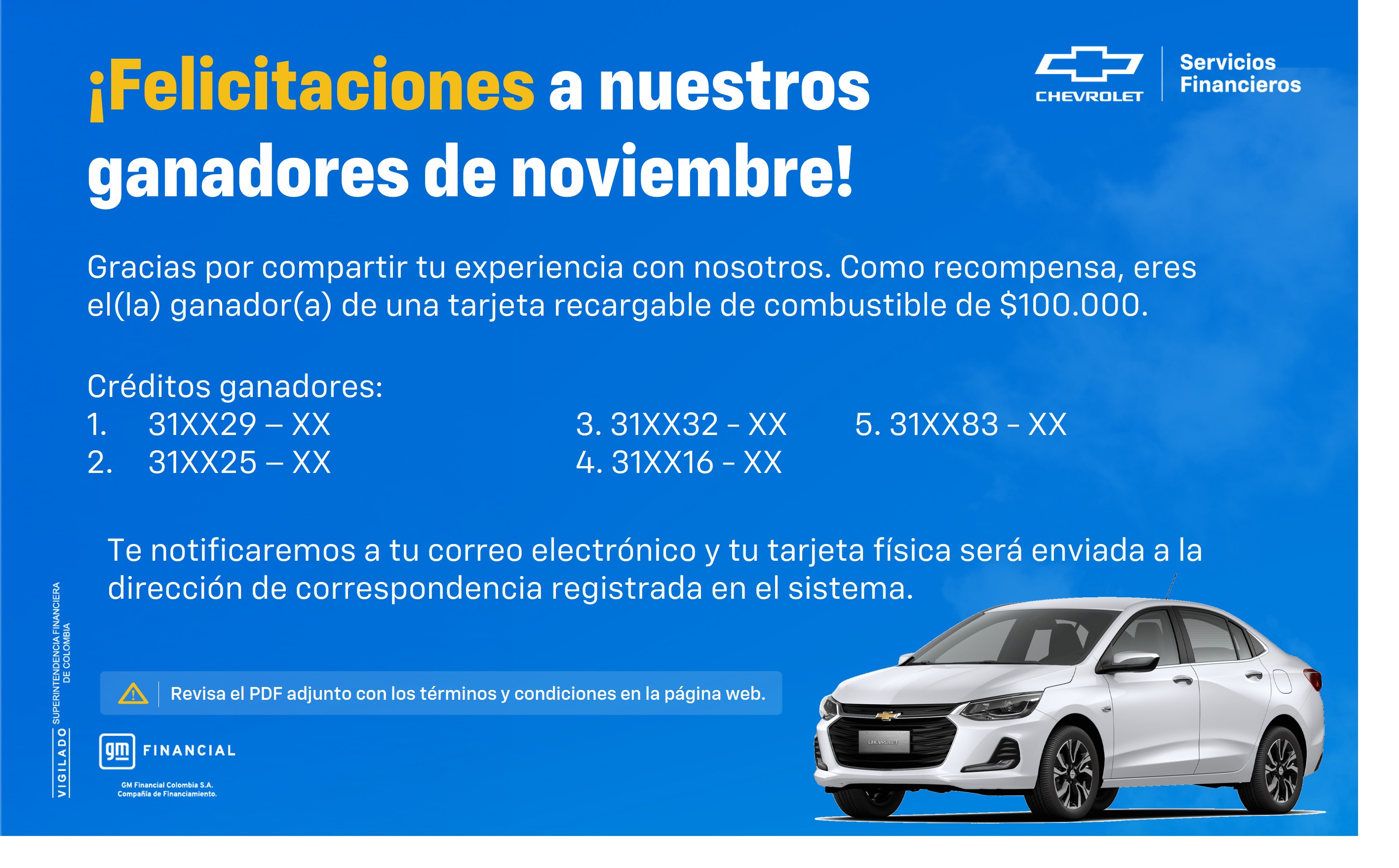 Los primeros 5 clientes que respondan la encuesta que enviamos por correo electrónico desde: ChevroletServiciosFinancieros@qualtrics-survey.com, recibirán una tarjeta recargable de combustible como agradecimiento.